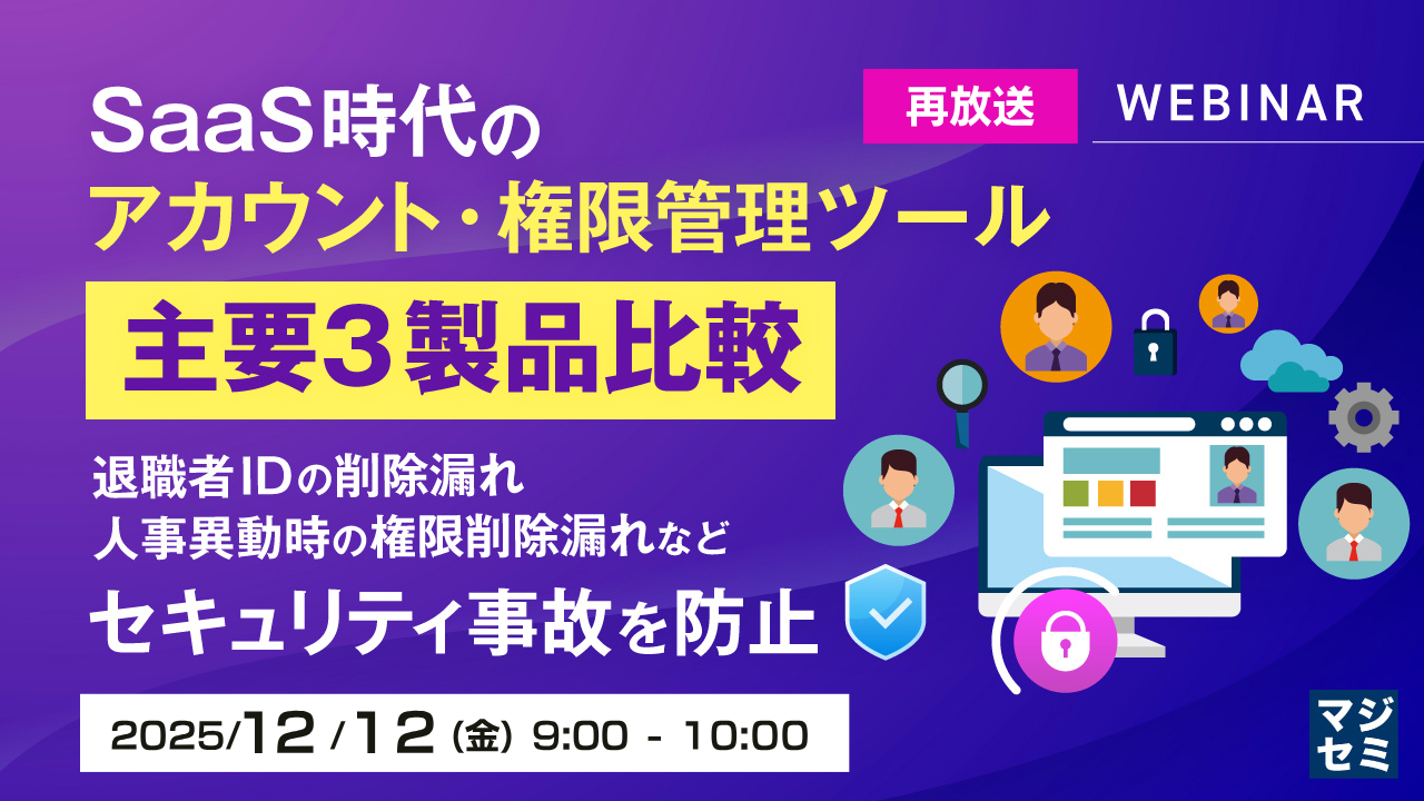 【再放送】SaaS時代のアカウント・権限管理ツール、主要3製品比較 ~退職者IDの削除漏れ、人事異動時の権限削除漏れなど、セキュリティ事故を防止~お申し込み