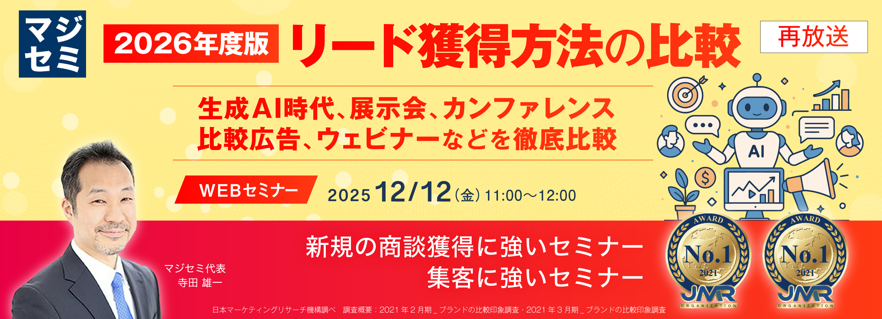 【再放送】2026年度版、リード獲得方法の比較 ~生成AI時代、展示会、カンファレンス、比較広告、ウェビナーなどを徹底比較~お申し込み