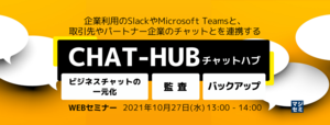 13:05~13:45 企業利用のSlackやMicrosoft Teamsと、取引先やパートナー企業のチャットとを連携する「CHAT-HUB(チャットハブ)」~ビジネスチャットの一元化、監査、バックアップ~