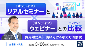本セミナーでは、年間1,000回以上のリアルセミナーおよびウェビナーを企画・運営しているマジセミが、それぞれのメリット・デメリットをデータに基づいて解説します。費用対効果、集客力、エンゲージメント、商談化率などの観点から両者を比較し、どのような目的・ターゲットに応じて最適な形式を選ぶべきかをご紹介します。