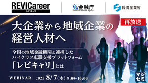 このセミナーでは、大企業出身の方を対象に、これまで大企業で培った豊かな経験やスキルを活かして、地域企業の経営人材として活躍する「レビキャリ転職」をご提案します。レビキャリの目的は地域金融機関を新たな人材仲介の担い手として育成し、「大企業から地域企業の経営人材へ」という新しい人の流れを、日本全国に創出することです。同時に、有為な大企業人材の方々の活躍の機会を広げ、地域企業の成長・発展を通じて、ひいては地域経済や日本企業の活性化につなげていくことも目指しています。近年、日本の人材市場や民間人材紹介ビジネスは急拡大していますが、現状では「若年層の人材×大都市部の企業」の人材マッチングは、社会的ニーズは非常に強いものの、収益性や事務負担等ビジネス上の理由もあって、既存の民間人材紹介サービスだけでは十分カバーすることは難しいのが現状です。このような構造的な人材ミスマッチ問題の解決を図るために生まれた人材仲介プラットフォームが、「REVICareer(レビキャリ)」です。 このセミナーでは、実際にレビキャリ転職を体験され、大企業から地域企業の経営人材に転職された方々の実像や具体的事例を紹介しながら、レビキャリ転職のメリットや魅力について、詳しく解説します。