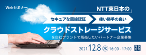「クラウドストレージサービス」を自社ブランドで販売したいパートナー企業募集 ・テレワークやセキュリティを取り巻く環境 ・オンラインストレージの選定ポイント ・NTT東日本が提供する『コワークストレージ』とは?活用メリット、機能のご紹介、エンドユーザの導入事例 ・ストレージビジネスへの参入方法、パートナープログラムと提案モデルのご紹介