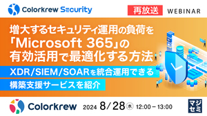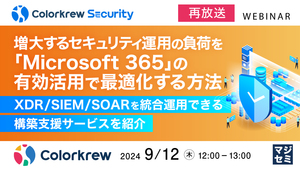 本セミナーでは、Microsoft 365導入済み、または導入検討中の企業の情報システム部門/セキュリティ運用の担当者を対象として開催します。 まず、ライセンスごとのセキュリティ製品・サービ群、機能を分かりやすく整理します。Microsoft 365が実現するセキュリティ対策への理解を深めた上で、どのように活用すれば日々のセキュリティ運用の様々な課題を解決できるかを解説します。 さらに、2023年に日本マイクロソフトの「Secure multicloud environment Award」を受賞したColorkrewが提供する「Microsoft 365セキュリティ支援」サービスを紹介。独自の脅威検知機能や柔軟なアラートのカスタマイズなどに加え、Microsoft 365ライセンスで使用可能なセキュリティ・サービスの導入支援、その後の監視運用まで総合的に支援するソリューションについて、その概要や導入効果などをご説明します。「セキュリティベンダーや製品を統合したい」「セキュリティ運用のコストを抑えたい」という方は、ぜひご参加ください。