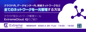 そこで本セミナーでは、運用管理を一元化し、複雑化したネットワークを簡単に管理できるようにする方法として、世界中で展開されているクラウドベースのSaaSソリューション、Extreme Networks社の「ExtremeCloud IQ」をご紹介します。 ネットワークモニタリング、レポーティング、アラート、分析といった機能を集中管理できる「ExtremeCloud IQ」が如何にお客様の課題にお応えできるかについて、デモも交えてご説明いたします。