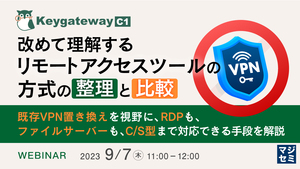 本セミナーでは、改めてリモートアクセスツールの方式について整理をした上で、それぞれの方式を比較します。 また、「脱VPN」を実現し、ファイルサーバーやC/S型システム、さらにRDPにも対応できる接続サービス「KeygatewayC1」のご紹介をします。
