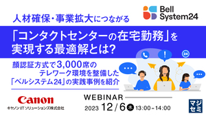 人材確保・事業拡大につながる「コンタクトセンターの在宅勤務」を実現するには、どうすればよいのでしょうか。 本セミナーは、自組織でコンタクトセンターを運用する企業の方を対象として実施します。オペレーターの在宅勤務に成功した事例として、コンタクトセンター業界のリーディングカンパニーであるベルシステム24の取り組みを紹介。パンデミック以前からテレワーク環境の整備を進めてきた同社では現在、3,000席の在宅ブース数を誇る「在宅コンタクトセンター」でオペレーターが従事しています。将来的には完全在宅を含め10,000席までの拡大を見据える中、これまでの取り組みで実感した「在宅あるある課題3選」を体験談を交えて解説します。 また、ベルシステム24が提供する在宅コンタクトセンターサービス「Bell@Home」、キヤノンITソリューションが提供する在宅オペレーターの働きやすさの確保と情報漏えい対策を両立できるクラウド型テレワーク支援サービス「テレワークサポーター」についてもご説明します。コールセンター事業における人材確保や事業拡大を実現する実現のヒントを得たい担当者の方は、ぜひご参加ください。