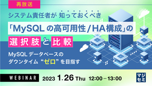 レプリケーション機能による冗長構成、アクティブ/スタンバイ型のクラスタ構成など、MySQLにおいてダウンタイムを短くし、高可用性を実現する方法はいくつか選択肢があります。 しかしながら、それぞれメリットとデメリットがあり、双方の観点から検討する必要があるため、自社にとって何が最適かわからないとお悩みの方も多いのではないでしょうか。
