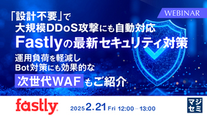 本セミナーでは、より高度な対策が求められるDDoS攻撃など、Webアプリケーションの脆弱性を狙うサイバー攻撃への対策を実現したい企業・組織の担当者を対象に開催します。サイバー攻撃への最適な対応策として、Fastlyが提供する次世代WAF「Fastly Next-Gen WAF」をご紹介します。特に、2024年10月に搭載された「DDoS自動防御」機能などを中心に、デモや導入事例を交えてオンプレミス/クラウド環境を問わず統一したセキュリティ運用を容易に実現できる点をご覧いただきます。 「DDoS攻撃やボット攻撃などによるセキュリティインシデントを防ぎたい」「WAFを導入しているが、運用や機能面で何らかの不満を抱えている」「今後のビジネス展開を見据えて、Webアプリケーション対策を改善したい」と検討されている方は、ぜひご参加ください。