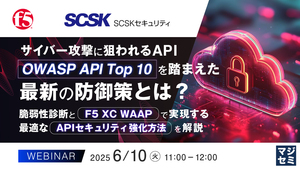 クラウドの利用拡大でサイバー攻撃に狙われるリスクが高まっているAPI。そのセキュリティをどう強化していけばよいのでしょうか。 本セミナーは、「OWASP API Top 10」に対する具体的な防御策を解説します。また、多くの顧客が抱えるセキュリティ課題を解決したSCSKセキュリティのAPIに対する脆弱性診断の実績や実際に検出された脆弱性の事例を踏まえてご紹介します。さらに、APIセキュリティを強化する最適なソリューションとして「F5 XC WAAP(Web Application and API Protection)」を提案し、その活用方法を詳しく解説します。 「APIセキュリティを強化したい」「『OWASP API Top 10』に対する具体的な防御策が知りたい」「自社に最適なAPIセキュリティの実践方法を知りたい」とお考えの企業・組織のセキュリティ運用を担う方は、ぜひご参加ください。