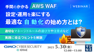 AWS WAFを導入しても、初期設定や運用方法に悩む企業は少なくありません。そこで本セミナーでは、AWS WAFの自動運用化によって、防御を効果的に維持するための最適な方法や留意点を解説します。さらに、GMOサイバーセキュリティbyイエラエが提供する「WAFエイド」をご紹介。世界屈指の技術力を持つ同社のセキュリティアナリストの知見を共有したり、独自開発の検知ルール(シグネチャ)を追加することで、セキュリティエンジニアでなくても高精度な運用が可能となる点など具体的な特長もご説明します。 「AWS WAFの導入を考えている」「導入してみたが、なんとなくで放置している」という企業・組織の方は、最適な自動運用を実現するヒントをぜひ参考にしてください。