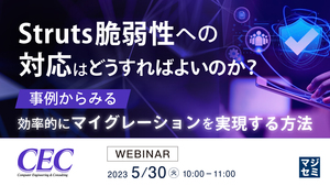 本セミナーでは、Strutsから最新フレームワークへの移行を現行機能を維持しながら行う具体的な方法を解説します。 具体的には、株式会社シーイーシーが提供するマイグレーションサービス「Re@nove®(リノーブ)」を用いて、効率的かつ安全に移行する手法について詳しく説明します。 Strutsの脆弱性・リスク対策の必要性を認識しているものの、なかなか着手できていない、具体的な移行方法がわからないとお悩みの企業様はぜひご参加ください。