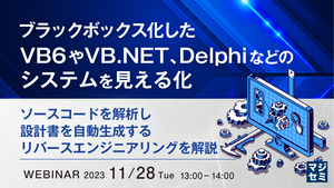 13:05~13:45 ブラックボックス化したVB6やVB.NET、Delphiなどのシステムを見える化 ~ソースコードを解析し、設計書を自動生成するリバースエンジニアリングを解説~