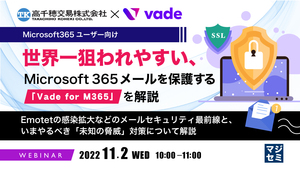 10:05~10:45 【Microsoft365ユーザー向け】世界一狙われやすい、Microsoft365メールを保護する「Vade for M365」を解説 〜Emotetの感染拡大などのメールセキュリティ最前線と、いまやるべき「未知の脅威」対策について解説〜