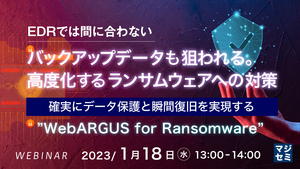 本セミナーでは一般的なランサムウェアへの対策における課題を踏まえ、確実なデータ保護、データ瞬間復旧を両立する”WebARGUS for Ransomware”をご紹介致します。 ランサムウェア対策をご検討中の方、現在の対策に不安をお持ちの方は是非本セミナーにご参加ください。