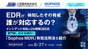 「ランサムウェア対策をはじめとするセキュリティ対策を強化したいが、限られた人員とリソースでは対応しきれない」――本セミナーは、そうした課題を抱える企業・組織の情報システム部門、セキュリティ運用の担当者の方を対象に開催します。 限られた人員と予算の中でEDRなどのエンドポイント対策ツールを有効活用する方法として、専門知識を持つ人材が適切な運用を支援する「MDR(Managed Detection and Response)」サービスをご提案。MDRの必要性を解説するとともに、その最適な選択肢として、導入企業は3万社を超える「Sophos Managed Detection and Response」をご紹介します。 さらに、セキュリティ運用の負荷軽減する方法として、エンドポイントとネットワークの両領域で専門性の高いエンジニアが5年以上にわたる導入支援の実績を持つ、三信電気の「SOPHOS MDR導入支援メニュー」についてもご説明します。MDRの効果的な利用方法を知りたい方は、ぜひご参加ください。