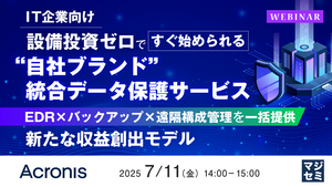 本セミナーでは、顧客の情報資産を統合的に保護できる仕組みから提供企業が増えつつある「マネージドサービス」を自社ブランドとして即時提供していく方法について、また、“EDR×バックアップ×遠隔管理” の統合運用管理をAcronis Cyber Protect Cloudのプラットフォームを活用して実装する方法を解説します。 構築ステップ、料金設計、販促ツール〈情報セキュリティ5か条+バックアップ〉活用術まで具体例を示し、最短で高収益化を実現するロードマップを共有します。