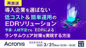 本セミナーでは、限られた予算と人材でも導入・運用可能なEDRソリューション「Acronis Cyber Protect」についてご紹介します。完全日本語対応のインターフェースによる直感的な操作性、専門知識がなくても運用可能な設計思想、そして中小企業でも導入しやすい価格体系を実現したソリューションについて、製品操作デモを交えながら詳しくご説明します。