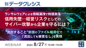 13:05~13:45 ランサムウェアによる情報漏洩で株価急落、信用失墜…経営リスクとしてのサイバー攻撃から企業を守るには? 〜“流出すること“前提のファイル暗号化で「流出しても被害なし」を実現〜
