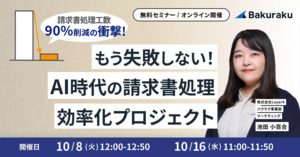 開催日:2024/10/08(火) 12:00-12:50、2024/10/16(水) 11:00-11:50 視聴方法:オンライン配信(Zoom) 参加費:無料 ※お申し込みフォームに入力後、視聴情報が記載されたメールが届かない方はお手数ですが、(bakuraku-marketing@layerx.co.jp)までご連絡ください。