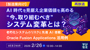 15:05~15:50 【製造業向け】AI時代を見据え企業価値を高める“今、取り組むべき”システム変革とは? 〜老朽化システムのリスクと先進AI搭載Oracle Fusion Applications活用例〜