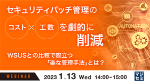 また、WSUSを運用している方や今後利用を検討されている方も多いと思いますが、WSUSとの詳細な比較をウェビナーの中で解説いたします。 実際に導入された企業の課題や、導入により大幅に運用コストを削減できた事例などをあわせてご紹介いたします。 パッチ管理の対象が数千名規模となる企業の決裁者、ご担当者様にオススメのウェビナーです。