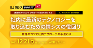 IIJは、情報システム関連部門で働く方に向け、日々の活動や組織運営のヒント、そして他者/他社とのつながりづくりのきっかけとなるような情報を「IIJ 情シスBoost-up Project」を通してお届けしています。 その取り組みの一つである「Motivate Seminar」は、有識者による講演を通じて、業務における課題解消の糸口や、明日への活力を得る場としてお役立ていただきたく開催するセミナーです。
