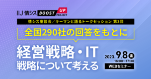 第3回の今回は、「経営戦略・IT戦略」をテーマに設定しました。IIJが実施した経営・IT戦略に関する調査結果を紹介しながら、パネリストと共に議論します。 当日は参加者からのコメント、QAも積極的に採用しながら議論を展開します。是非IT戦略に関わる当事者として一緒に考えてみませんか?