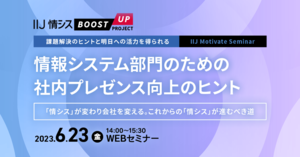IIJは情報システム関連部門で働く方に向けて、日々の活動や組織運営のヒント、そして他者/他社とのつながりづくりのきっかけとなるような情報を「IIJ 情シスBoost-up Project」を通してお届けしています。 その取り組みの一つである「Motivate Seminar」は、有識者による講演を通じて、業務における課題解消の糸口や明日への活力を得る場としてお役立ていただきたく開催するセミナーです。