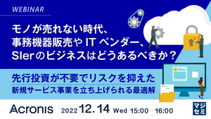 本セミナーでは、事務機器販売やITベンダー、SIerの方を対象に、「マネージドサービス事業」への参入を成功させるためのヒントを解説します。 「案ずるより産むがやすし!」、アクロニスのサービス事業者向けプラットフォーム「Acronis Cyber Protect Cloud」を利用することで、簡単に先行投資不要、リスクフリー、月額¥30,000からのスモールスタートで新規MSP事業を開始することが可能です。 既存ビジネスに対する危機感を持たれている方は、ぜひご参加ください。