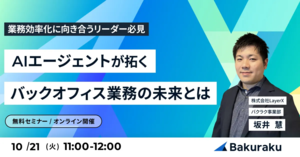 本セミナーでは、まず「そもそもAIエージェントとは何か?」という基礎から出発し、バックオフィスにおいてAIエージェントが求められる背景や、今後想定される業務の進化、そして実装について解説します。