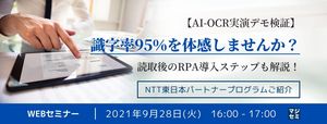NTT東日本では、パートナー企業様がICTサービスを自社ブランド・価格設定にて提供できるパートナープログラムを実施しています。 パートナー企業様は、在庫リスクや開発投資、導入後のサポート窓口の稼働確保をすることなく、新規ICT事業を始めることができます。本セミナーでは、 NTT東日本が提供するAI-OCR・RPAの特長、製造・物流業での事例、RPAのはじめ方、パートナープログラムのメリットと成功事例をご紹介します。