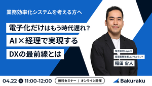 ✓ 経理業務効率化のシステム検討をする前に、業務フローや検討軸の整理を行いたい方 ✓ AIを活用した具体的なシステム活用や経理業務の効率化事例を知りたい方 ✓ 請求書や領収書など書類の電子化をしてみたが、期待通りの効率化まで至らず打開策を考えたい方