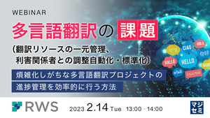 本セミナーでは、翻訳レビューの自動化によって上記の問題を解決する方法を解説します。 事前に登録した翻訳ルールを翻訳結果に自動適用することで品質を担保し、チェック作業の工数削減も可能にする翻訳支援ソフトウェア「Trados Studio」の紹介を行います。 翻訳対象によって品質がバラついてしまうとお悩みの、ソフトウェア業界で翻訳業務に携わっている方はぜひご参加ください。