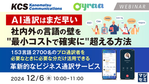 本ウェビナーでは、上述の課題を解決し外国語コミュニケーションを最適化させる日本発の通訳ソリューション『Oyraa (オイラ) 』をご紹介いたします。「通訳者グローバルネットワーク ✕ アプリ」により、下記のような価値を実現しています。 ・153言語2,700名の通訳者から最適な人材をご自身ですぐに見つけられる ・通訳者の即時呼び出し / 事前予約 の双方に対応 ・1分から利用可能で、明示された通訳レートに基づく明朗会計 ・オンライン会議 / 電話 (3者間通話) / 対面 と、あらゆる会話形態においてサポート可能 ・通訳者と直接コミュニケーションすることで、価格交渉や定期アサイン、その他柔軟な対応を依頼できる ウェビナーの中では、社内外でのコミュニケーション課題をOyraa活用で克服した事例を踏まえつつ、機能面も詳しく解説いたします。 外国人従業員とのコミュニケーションに課題を感じている方、海外との商談や打ち合わせを円滑に進めたいとお考えの方に特におすすめの内容です。