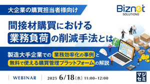 11:05~11:45 【大企業の購買担当者様向け】間接材購買における業務負荷の削減手法とは ~製造大手企業での業務効率化の事例と、無料で使える購買管理プラットフォームの解説~