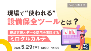 本セミナーでは、設備保全ツールを現場に根付かせるための選定ポイントや、蓄積されたデータを有効に活用するための運用の工夫をご紹介します。特に、現場の作業者がストレスなく使える直感的なUIを持つ「ミロクルカルテ」に注目し、その設計思想や活用事例を通じて、「記録される」から「活用される」へのステップを紹介。現場の声を反映した導入プロセスと、保全業務の高度化に向けた道筋をお伝えします。