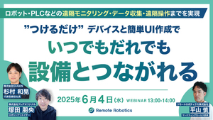 本セミナーでは、「ノーコード」ツールを活用し、誰でも簡単に遠隔操作を実現できる仕組みや、様々なタスクを代行するサービスについて紹介します。コストや人手の負担を抑えながら、製造現場の効率化を実現できる具体的な方法を、事例を交えて解説します。