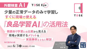 本セミナーでは、TDSE株式会社の革新的な外観検査AIソリューション「TDSE Eye」をベースに、最新の良品学習AIの動向と教師あり学習との比較、現場が実感するメリットや活用法について、具体的な導入事例とともに詳しくご紹介いたします。