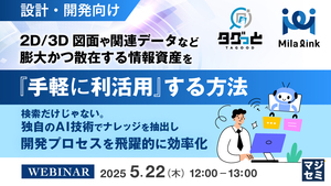 本セミナーでは、ミラリンクが提供する設計AIエージェント『タグっと』を活用し、膨大かつ散在する情報資産を“手軽に利活用”する方法について、具体的な活用例(BOMから関連図面を検索する方法)を交えながら詳しくご紹介します。
