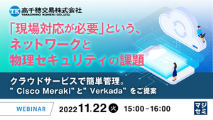 本セミナーでは、ネットワークや監視カメラなどの物理セキュリティの管理における課題と対策の方向性について解説すると共に、 具体的な解決策としてクラウド型ネットワーク管理ソリューション”Cisco Meraki”と、クラウド型統合セキュリティソリューション”Verkada”についてご紹介致します。高千穂交易だからこそできる、両ソリューションを合わせた対策もご提案可能です。ネットワークや監視カメラなどの物理セキュリティにストレスを感じている方、管理をよりシンプルにしたい方は是非本セミナーにご参加ください。