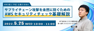 9:45~10:00 受付 10:00~10:05 オープニング(マジセミ) 10:05~10:45 サプライチェーン攻撃を未然に防ぐためのAWSセキュリティチェック基礎解説(NTT東日本) 10:45~10:55 質疑応答