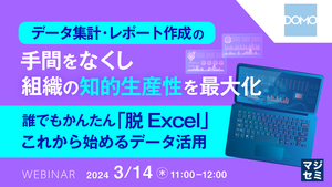 このセミナーでは、Excelなど表計算ソフトに頼るレポート作成から脱却し、知的生産性を上げる方法をデモを交え紹介します。限られた予算でも、まずはスモールスタートできるデータ活用ツールDomo