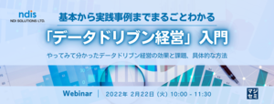 今回のセミナーでは、Domoを提供するドーモ株式会社との共催で ・なぜデータドリブン経営が必要なのか? ・データドリブン経営を行うメリット ・データドリブン経営に必要なツール ・データドリブン経営に最適なツールDomoとは何か? ・なぜNDISはDomoを選んだのか? ・Domoを使った担当者の本音の声 など、 データドリブン経営に関する基本的なことから、実際にNDISがデータドリブン経営を行うまでの過程と、データドリブン経営を行うことでどう変わったか?についてお伝えします。
