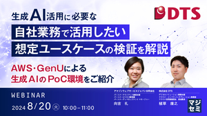 今回のセミナーでは、多彩なユースケースの検証が可能になるAWS環境の生成AIのPoC環境について紹介します。 アマゾンウェブサービスジャパンより、生成AIのトレンドやユースケースなどについて、株式会社DTSより「AWS生成AI PoC 支援サービス」を紹介します。