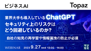 本セミナーでは、セキュリティ上のリスクを回避したChatGPTの導入と、社内での活用促進のポイントを解説しながら、Topaz社の「ビジネスAI」を紹介します。 早期の導入が経営課題となっている、生成AI導入で失敗したくないというご担当者の方々、ぜひご参加ください。