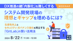 どうすればシステムの内製化を実現できるのでしょうか。本セミナーは、システムの内製化に取り組んでいる、またはこれから実践していきたい企業・組織のシステム開発・運用やセキュリティ担当、DX推進する部門に所属されている方を対象に実施します。 DX推進のカギを握る解決策となる内製化を成功に導くヒントを解説します。また、より安全で信頼性の高いシステム開発における効率化や品質管理の課題を整理し、その解決策として生産性とセキュリティを両立可能な「開発ライフサイクル」の進め方をご紹介。さらに「GitLab」の有効活用を支援する具体的なソリューションもご紹介します。「開発で用いるツールが乱立して非効率になっている」「開発生産性を向上させたいが、どこを改善したらよいのか分からない」「プロジェクト管理や開発の生産性向上の仕組みに加えて、セキュリティやガバナンスの強化を図りたい」など、自社でシステム開発の内製化や開発の効率化、円滑にプロジェクトを進めていきたいと考えている方は、ぜひご参加ください。