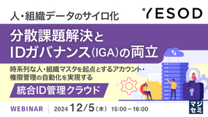 このような業務の煩雑さや、対応の漏れによる事故を防ぐためには、人事データやアカウント権限の一元管理を行うことが必要となります。 その結果、担当者の業務負荷を軽減し、事故の未然防止を実現でき、ガバナンス体制の強化も達成することができます。 しかし、一元管理を行うとしてもその手法やノウハウがないという方もいらっしゃるのではないでしょうか。 そうした方に向けて、本ウェビナーではIGA(Identity Governance and Administration)領域に特化したソリューションである統合ID管理クラウド「YESOD」をご紹介いたします。 以下の特長があり、数百名~数千名規模の多くの企業に活用をいただいています。 ・非直雇用を含むグループ全体の人・組織を一意に定め、属性・状態、等時系列なデータ管理が可能 ・グループ企業や部門単位で権限を設定でき、その範囲で、情報の参照・更新を行える ・項目の拡張が容易にでき、柔軟な入力制御によるデータ品質の担保が可能 ・画面、CSVに加えてWeb APIを用いて情報を入出力の自動化が行える ウェビナーの中では、導入いただいている企業の事例も踏まえ、活用方法を解説いたします。 多くの従業員や複数のグループ企業の管理が必要となるIT管理部門のご担当者様や人事・バックオフィス部門やDX推進のご担当者様に特におすすめの内容です。