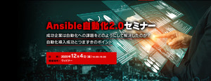 本セミナーは、レッドハット株式会社が主催するWebセミナー「Ansible自動化2.0セミナー:成功企業は自動化への課題をどのようにして解決したのか?自動化導入成功とつまずきのポイント」のご紹介です。