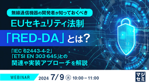 本セミナーは、2024年7月開催「無線通信機器の開発者が知っておくべき、EUセキュリティ法制「RED-DA」とは? ~「IEC 62443-4-2」「ETSI EN 303 645」との関連や実装アプローチを解説~」と同じ講演内容を含んでおります。多数のご要望をいただき、追加開催いたします。