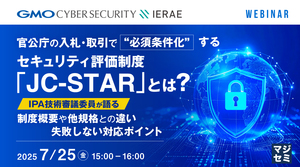 JC-STAR対応を進める上で「どこから始めればいいか」といった悩みを抱える企業は少なくありません。そこで本セミナーでは、JC-STAR技術審議委員会の委員を務め、各種国際標準の策定にも携わる製品セキュリティの専門家が、JC-STARの要件を分かりやすく解説するとともに、これまでの支援実績をもとに対応企業がつまずきやすいポイントとその回避策を説明します。 また、GMOサイバーセキュリティ by イエラエが提供する、主要な製品セキュリティ関連法規・認証への対応支援サービスもご紹介。官公庁向け製品を扱う商社やSIerの方々にとって、制度対応の“迷い”を解消する絶好の機会です。「制度の全体像がつかめない」「何から手をつければよいか分からない」とお悩みの方は、ぜひご参加ください。